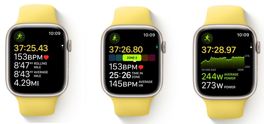 원래는 가장 왼쪽 사진에 있는 정보만 나왔었는데 이제는 디지털 크라운으로 3칸까지 구성이 돼서 운동 중에 훨씬 많은 정보를 확인할 수 있게 변경이 되었습니다.