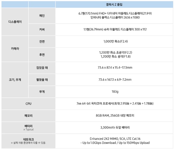 이부분은 좀 아쉽네요. 그리고 렘과 스토리지는 8GB와 256GB인데요 이번에 z플립 모델에는